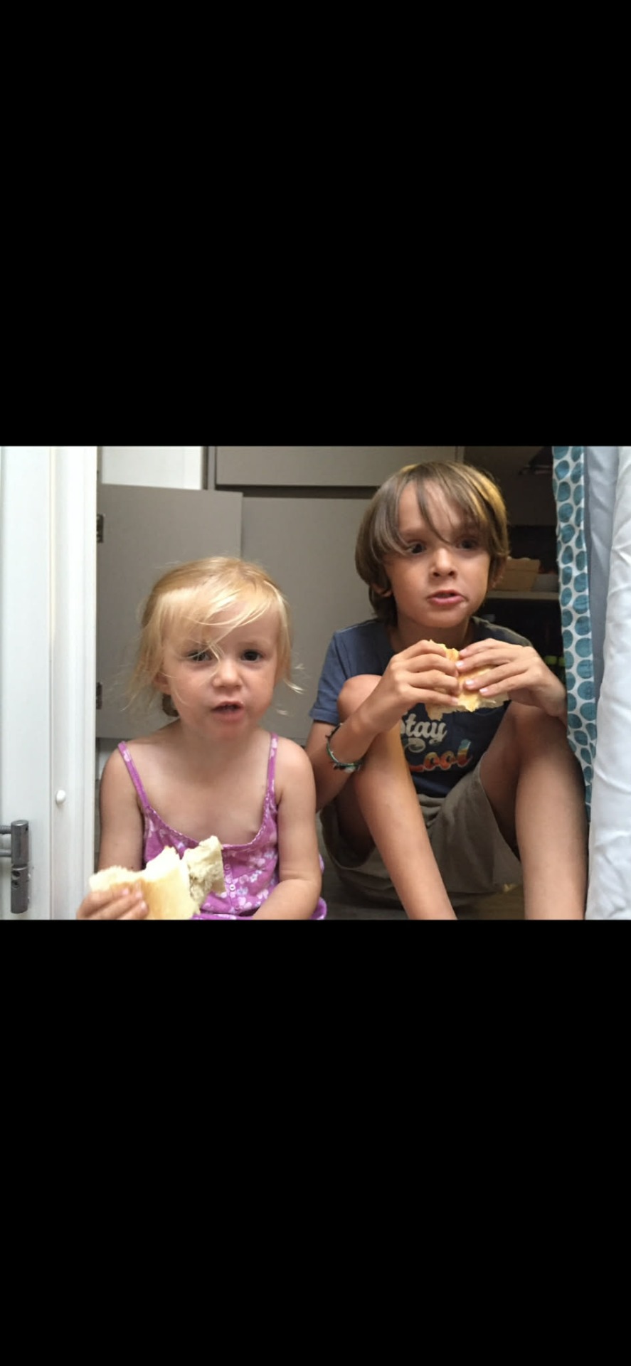 Noah et Emma proches avec un petit sandwich dans le mobil home des vacances.
